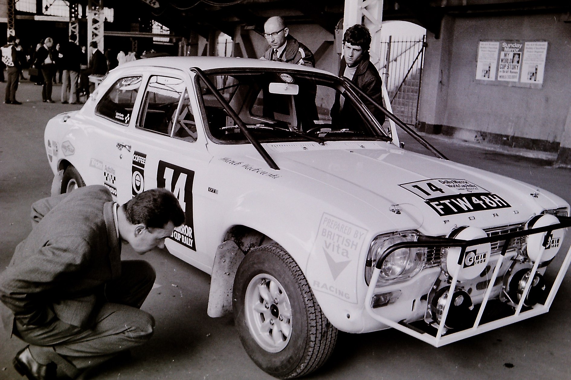 Ford Escort car 14 reg number FTW 48H in the 1970 World Cup Rally