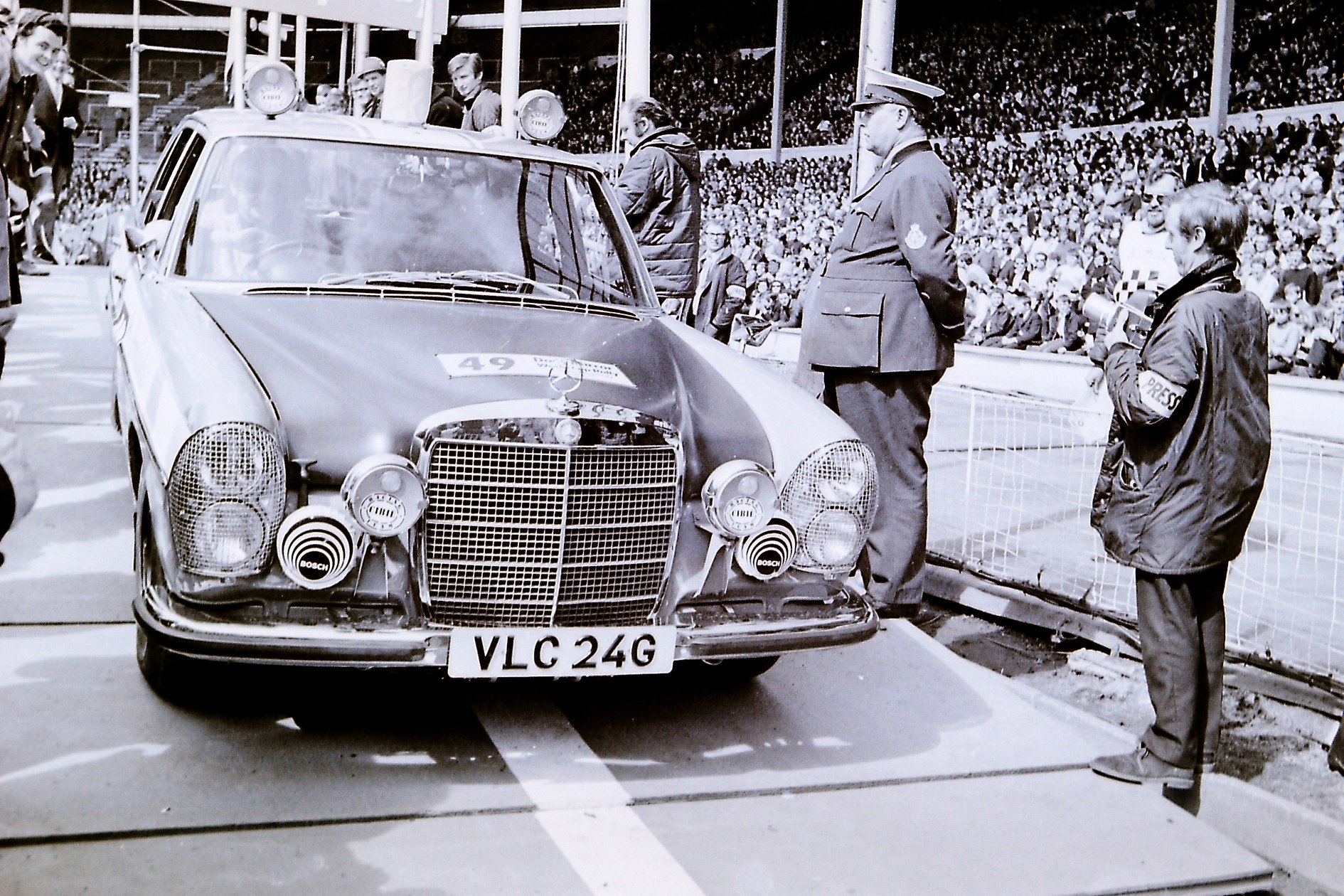 Mercedes Benz 280SE car 49 at start of the 1970 World Cup Rally