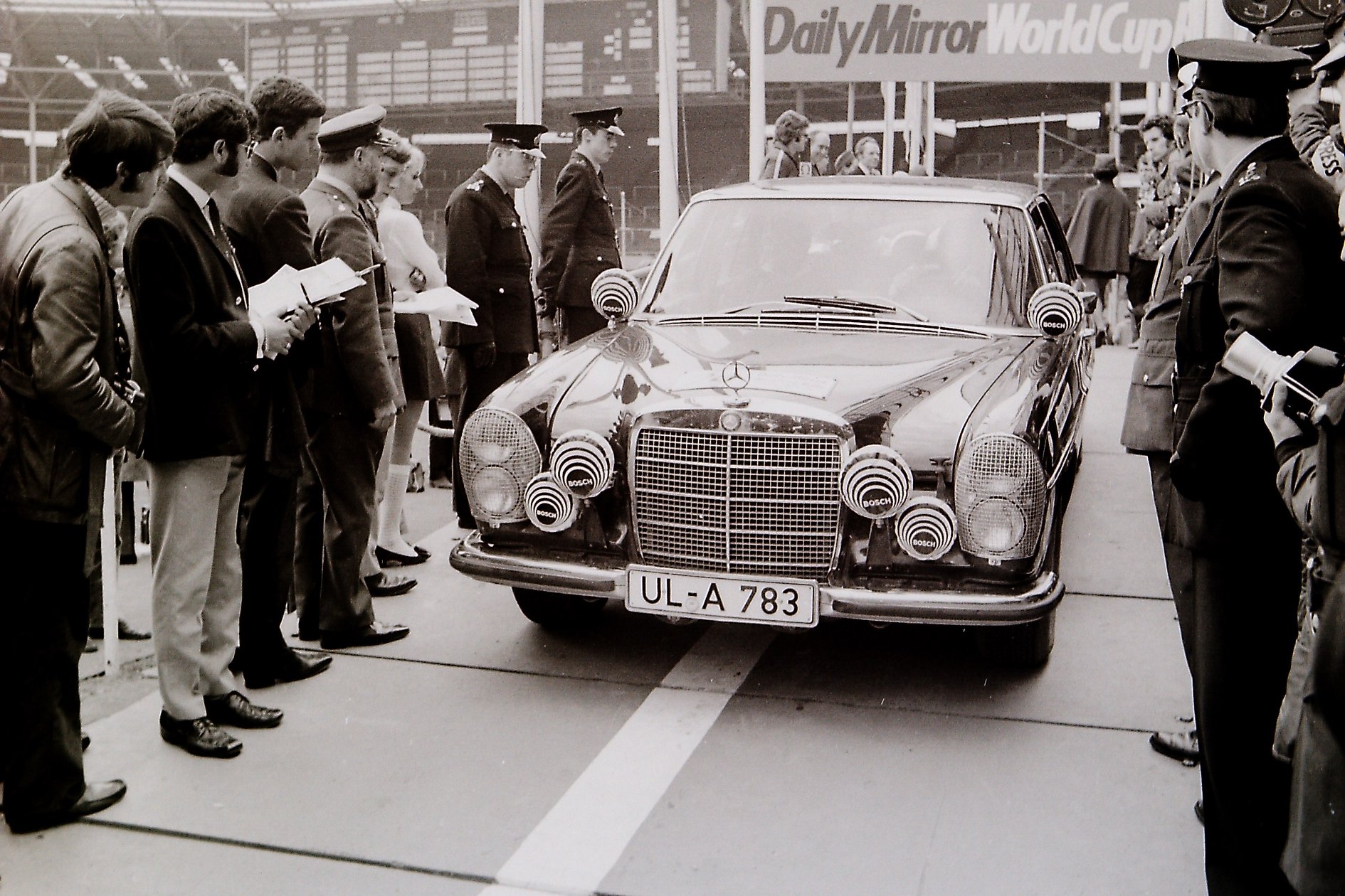 Mercedes Benz 280SE car 24 at start of the 1970 World Cup Rally