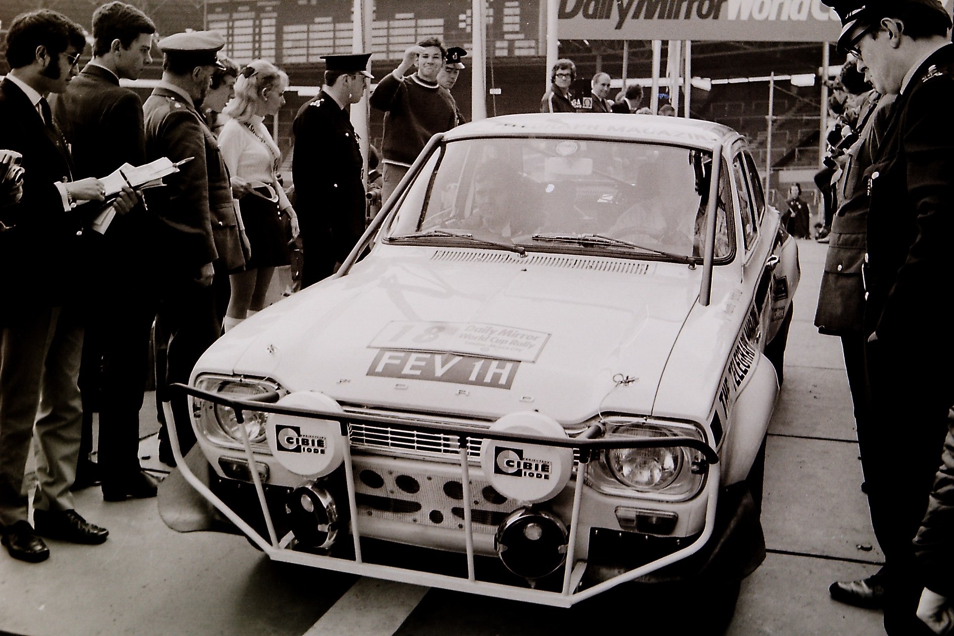 Ford Escort car 18 reg number FEV 1H in the 1970 World Cup Rally