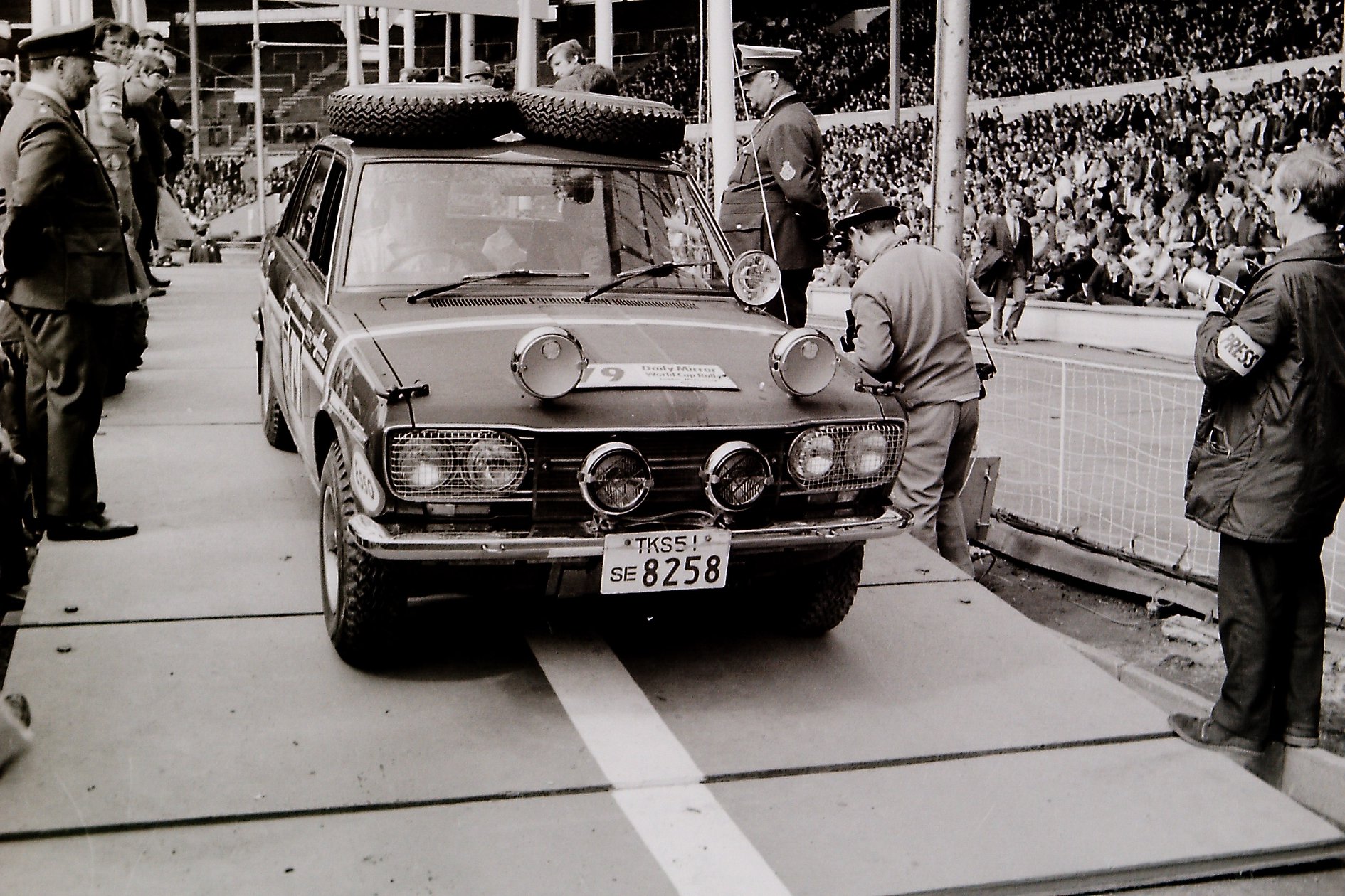 Mosvitch 412 at start of the 1970 World Cup Rally from Wembley stadium London
