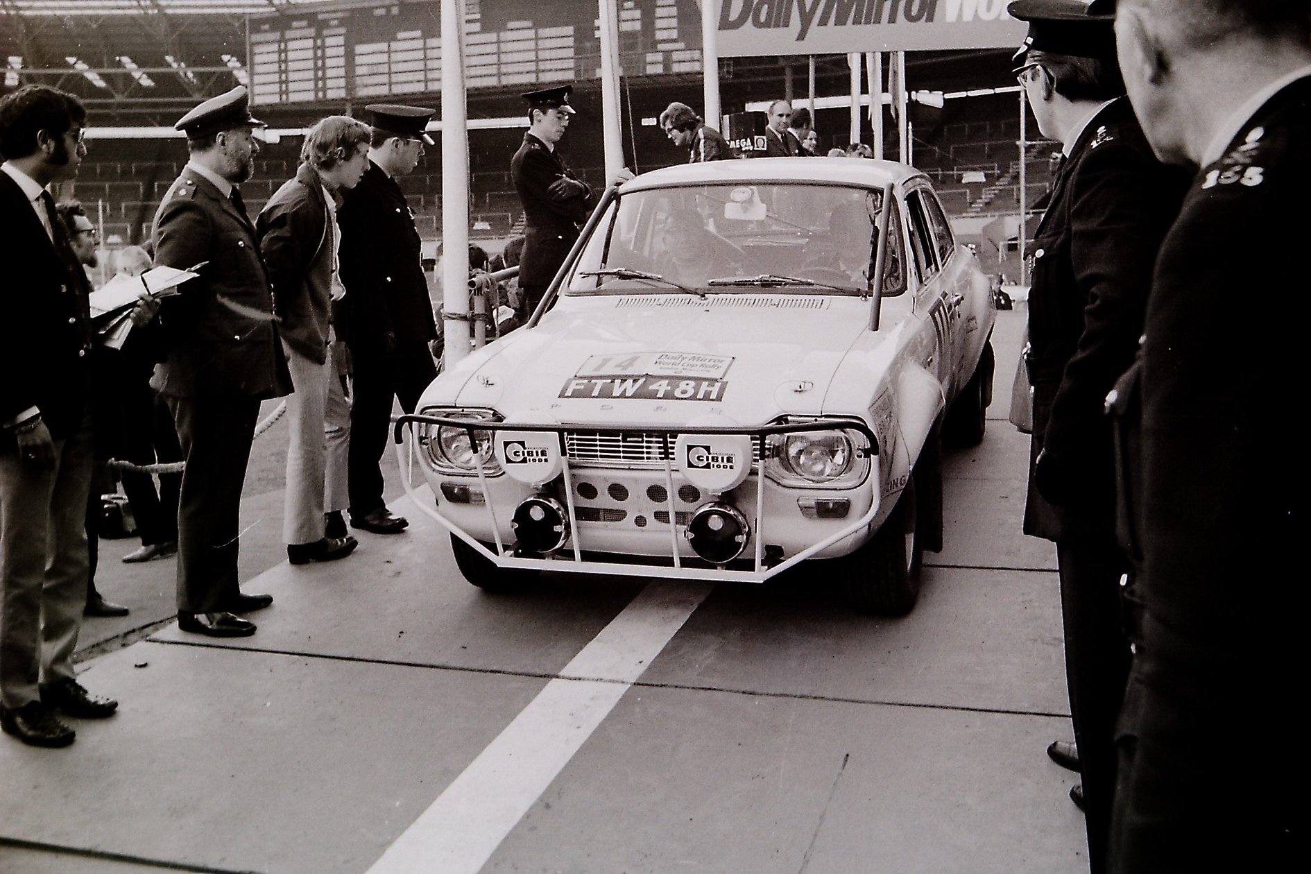 Ford Escort car 14 reg number FTW 48H in the 1970 World Cup Rally
