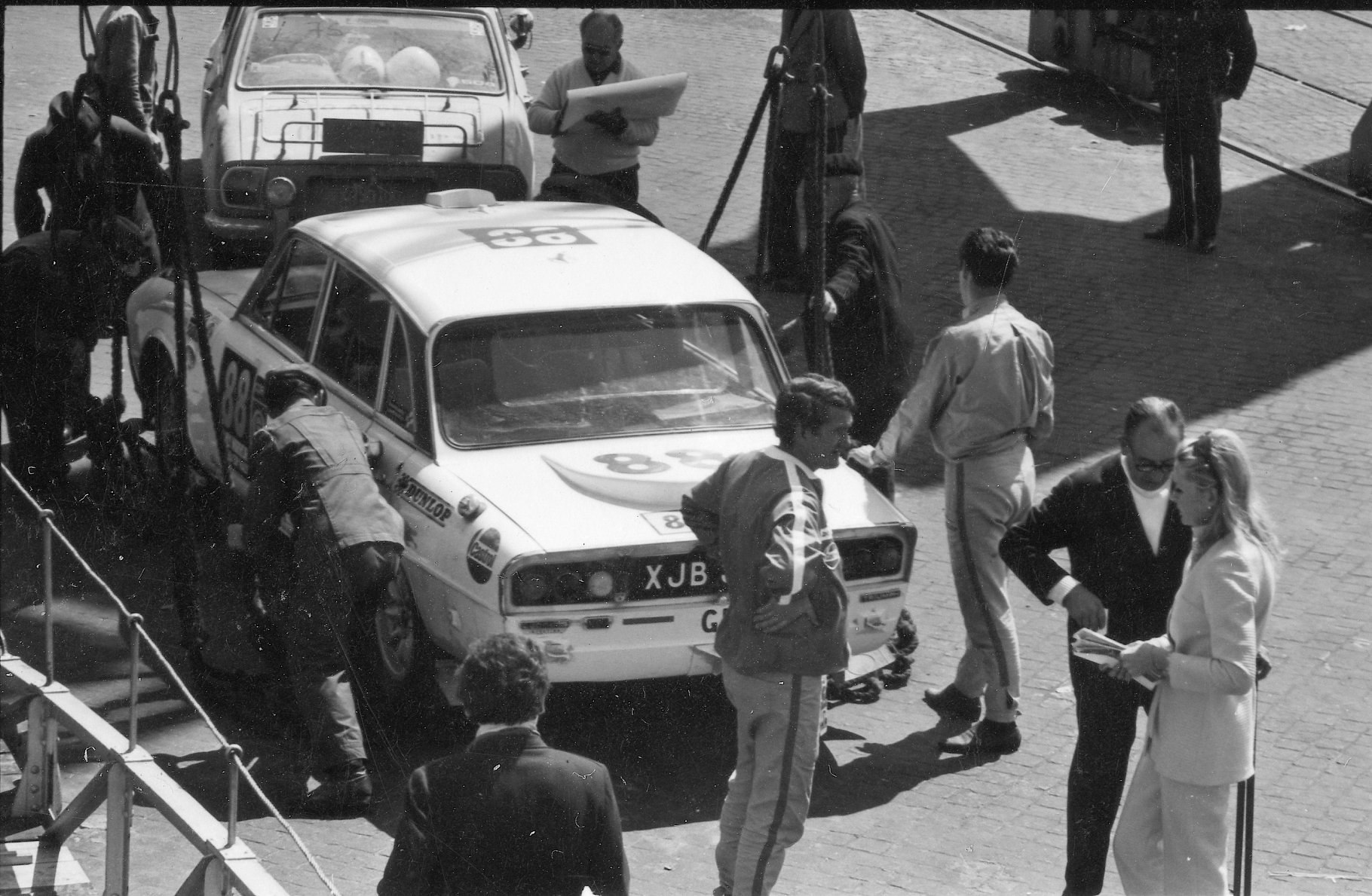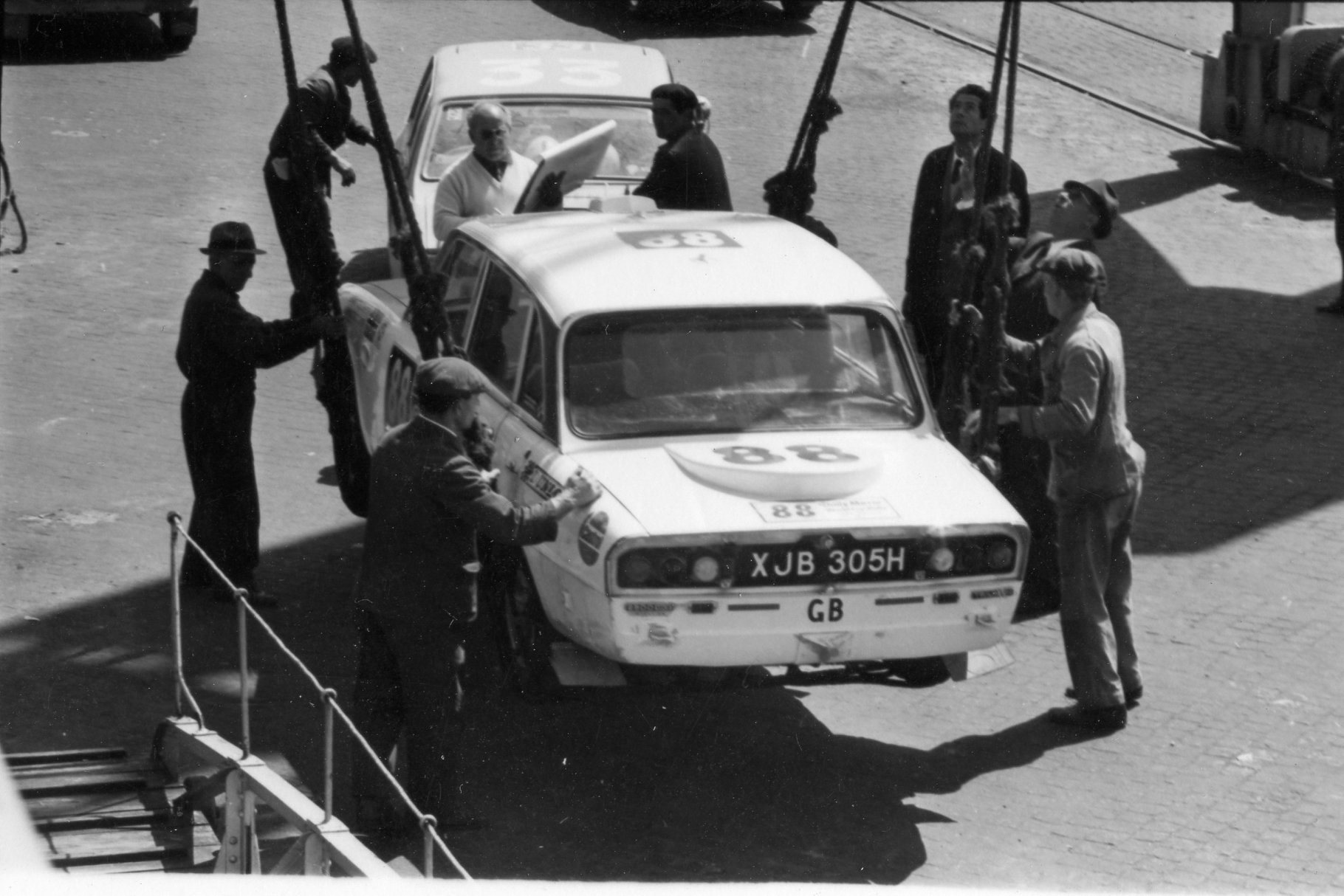 Triumph 2.5PI reg number XJB 305H car 88 in the 1970 World Cup Rally loading onto ship