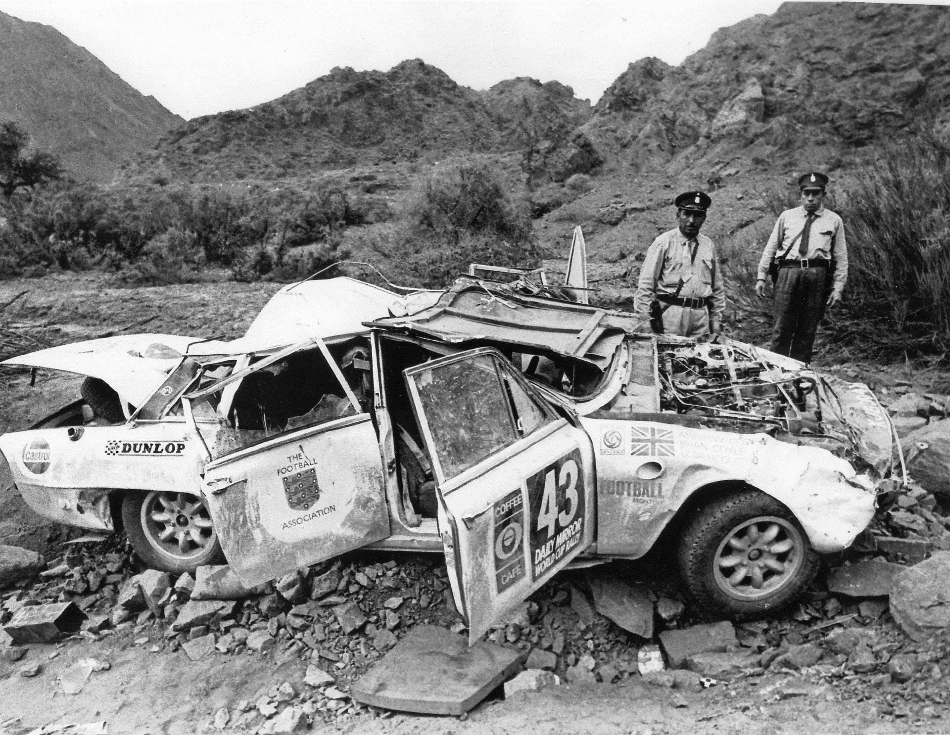 Triumph 2.5PI car 43 in the 1970 World Cup Rally crewed by Cowan Coyle Ossio car-crash