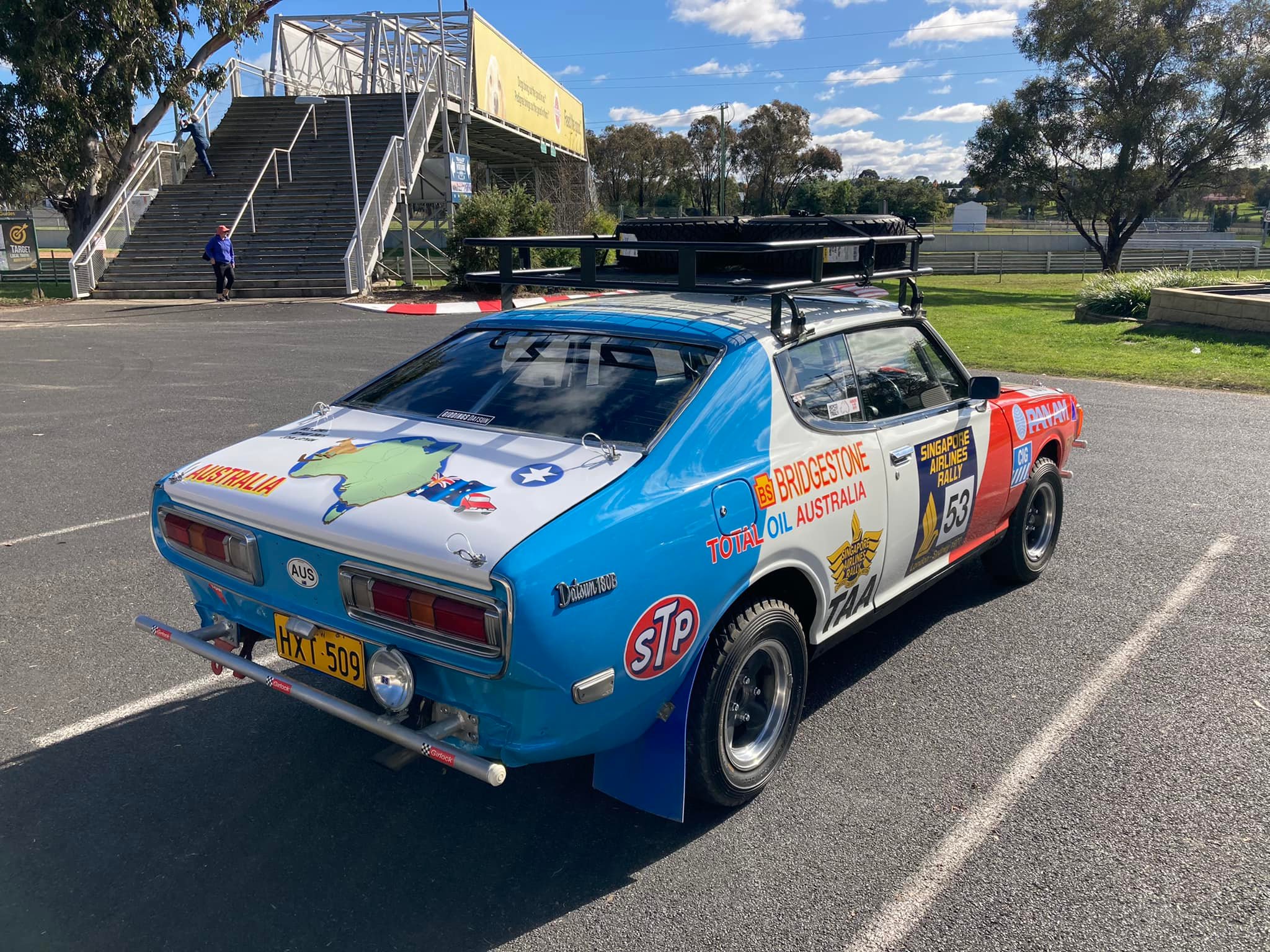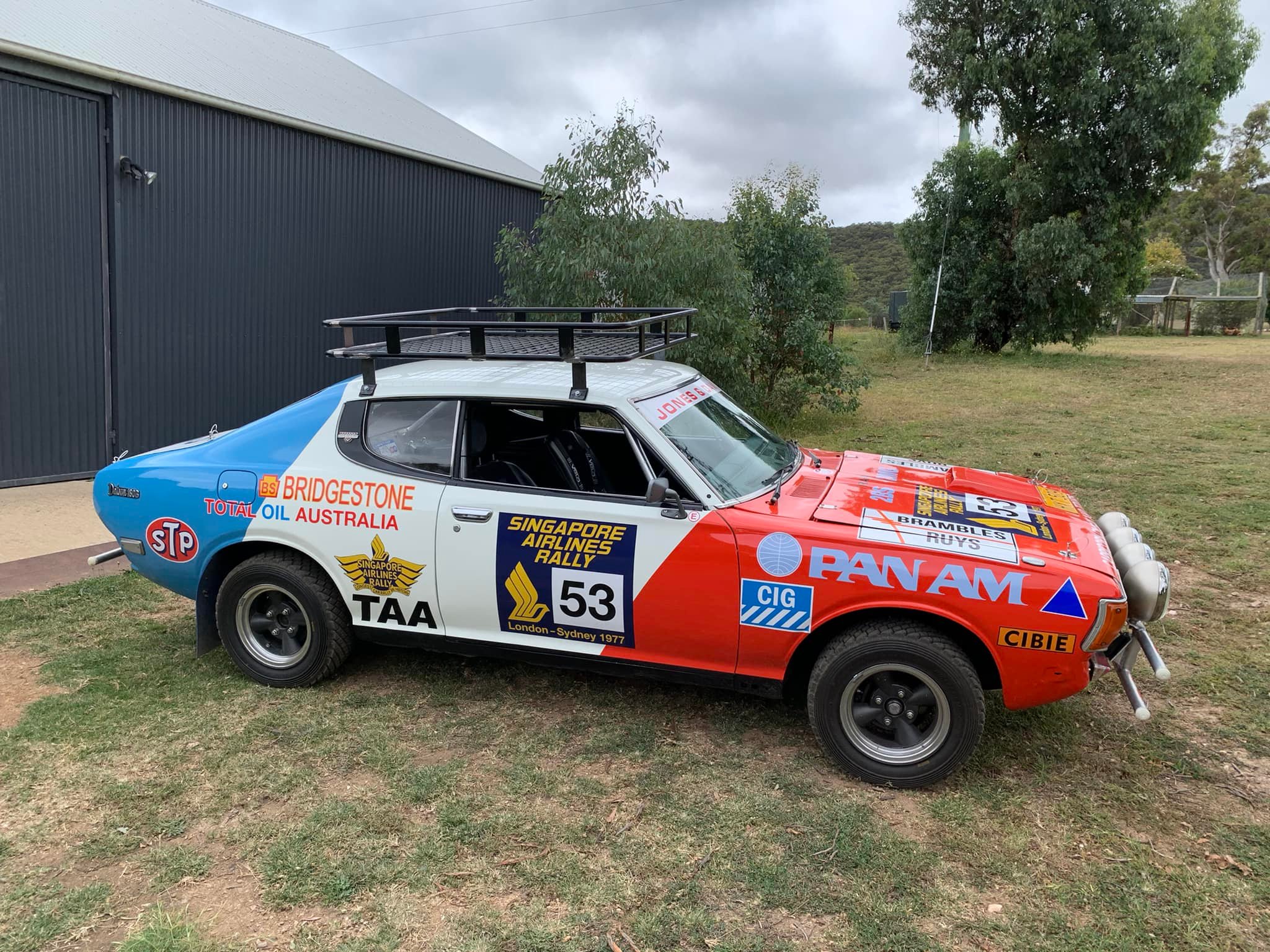 The Datsun 180B SSS, Car 53, in the 1977 London to Sydney Marathon Rally.