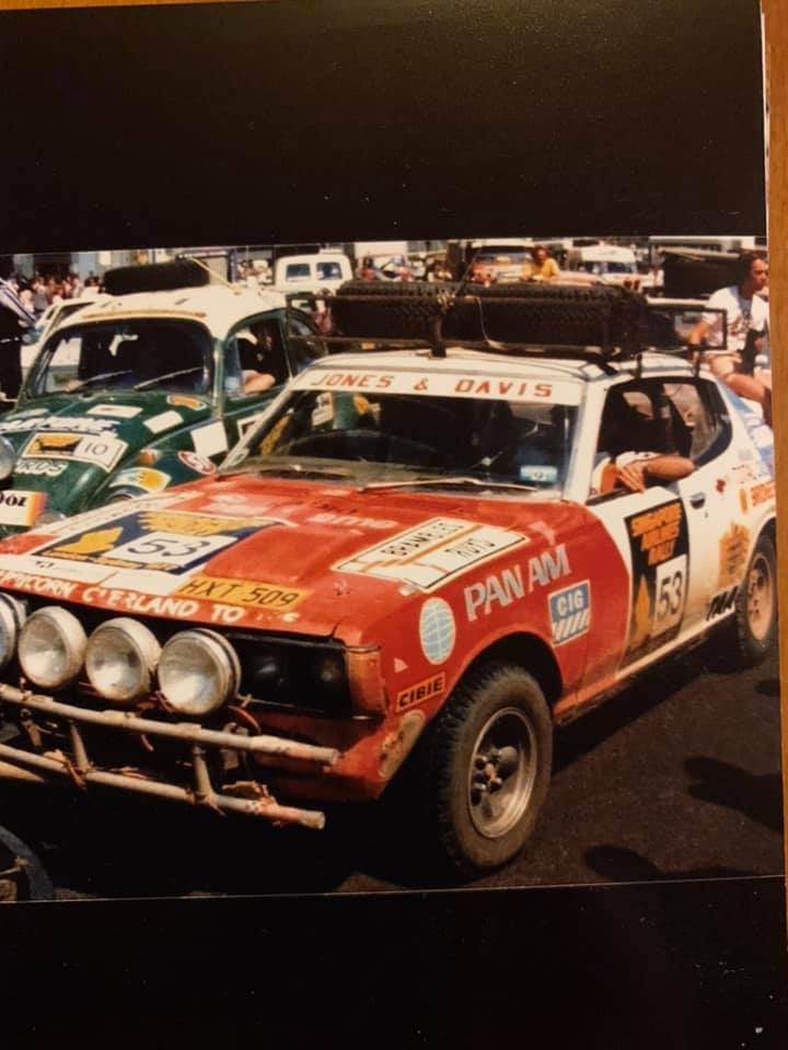 Datsun 180B SSS 1977 London to Sydney Rally car 53 team photo Rod Jones, Arthur Davis and John Latham