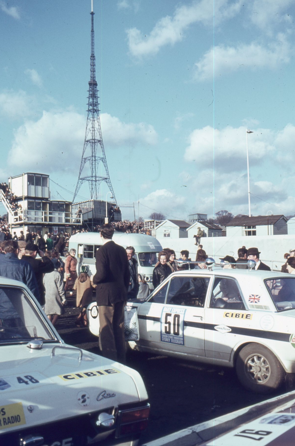 Ford Cortina Lotus cars 50 and 48 at the start of the 1968 London to Sydney Marathon Rally
