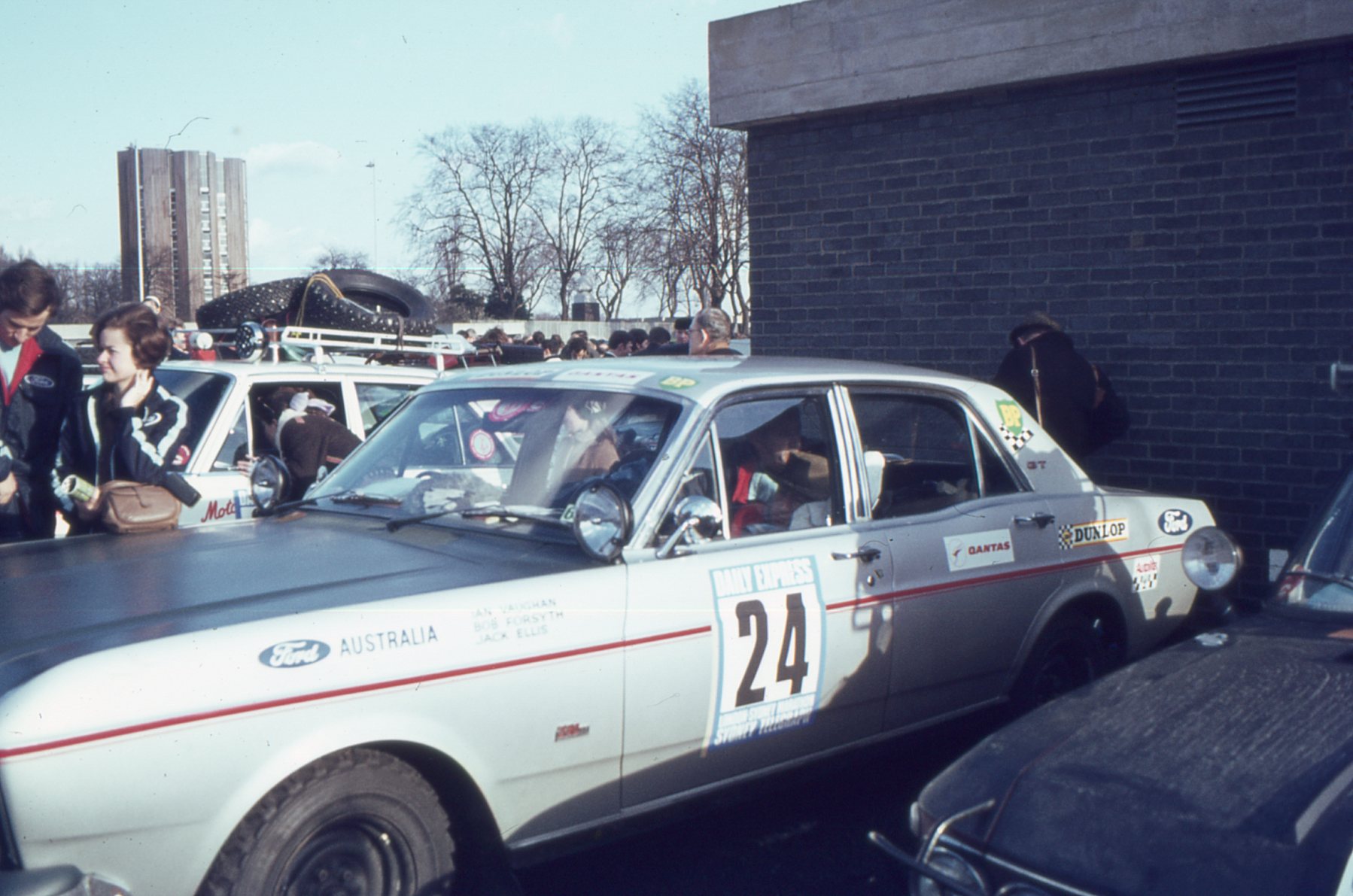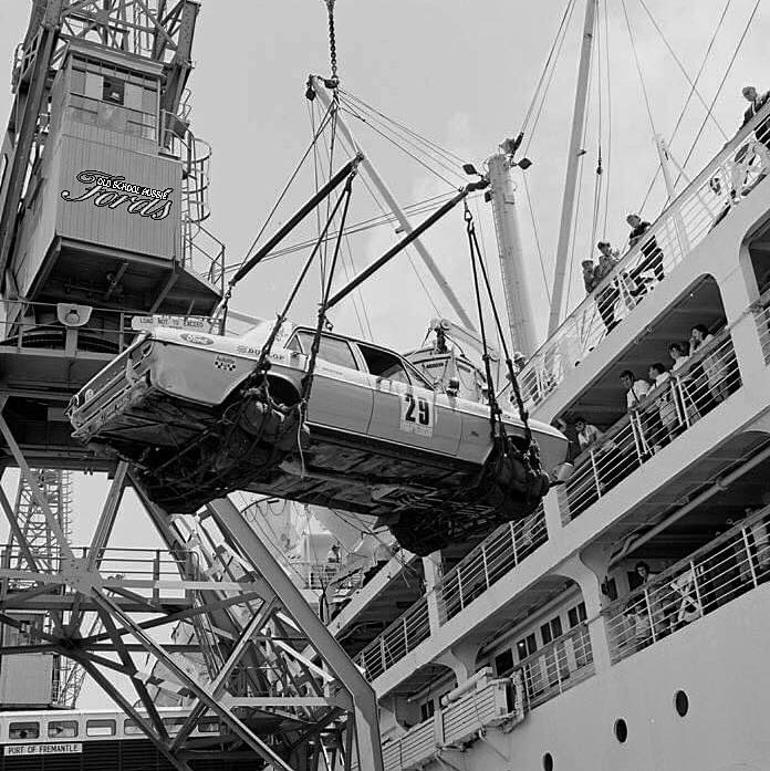 Car 29, an XT Falcon GT, registration number ‘KAG003’ – One of three Ford Australia factory works’ entries, prepared by Harry Firth; driven by Bruce Hodgson, and navigator Doug Rutherford, was unloaded before embarking on the final 2,600 mile drive to Sydney.