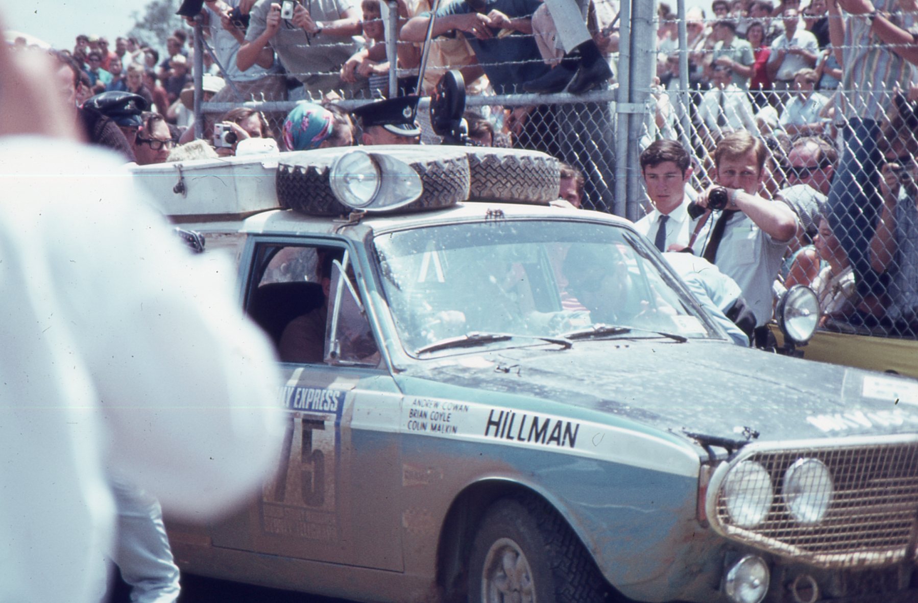 Hillman Hunter car 75 in the 1968 London to Sydney Marathon Rally at the Warwick Farm stage in Australia