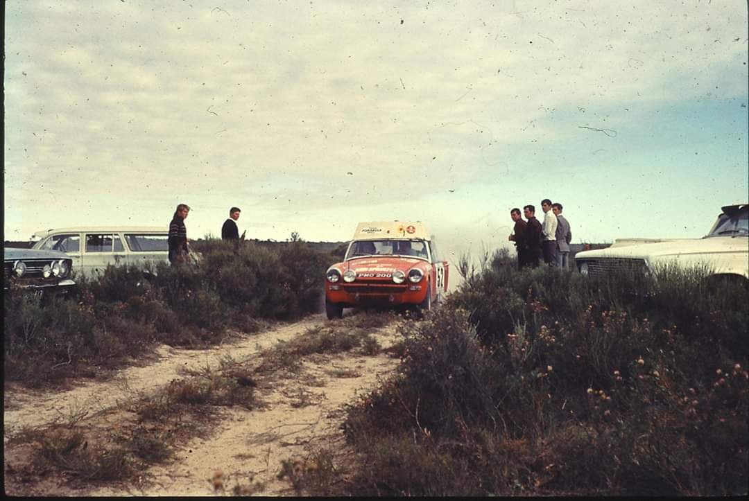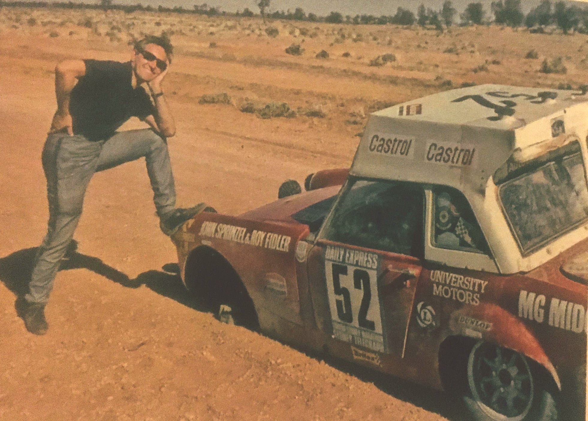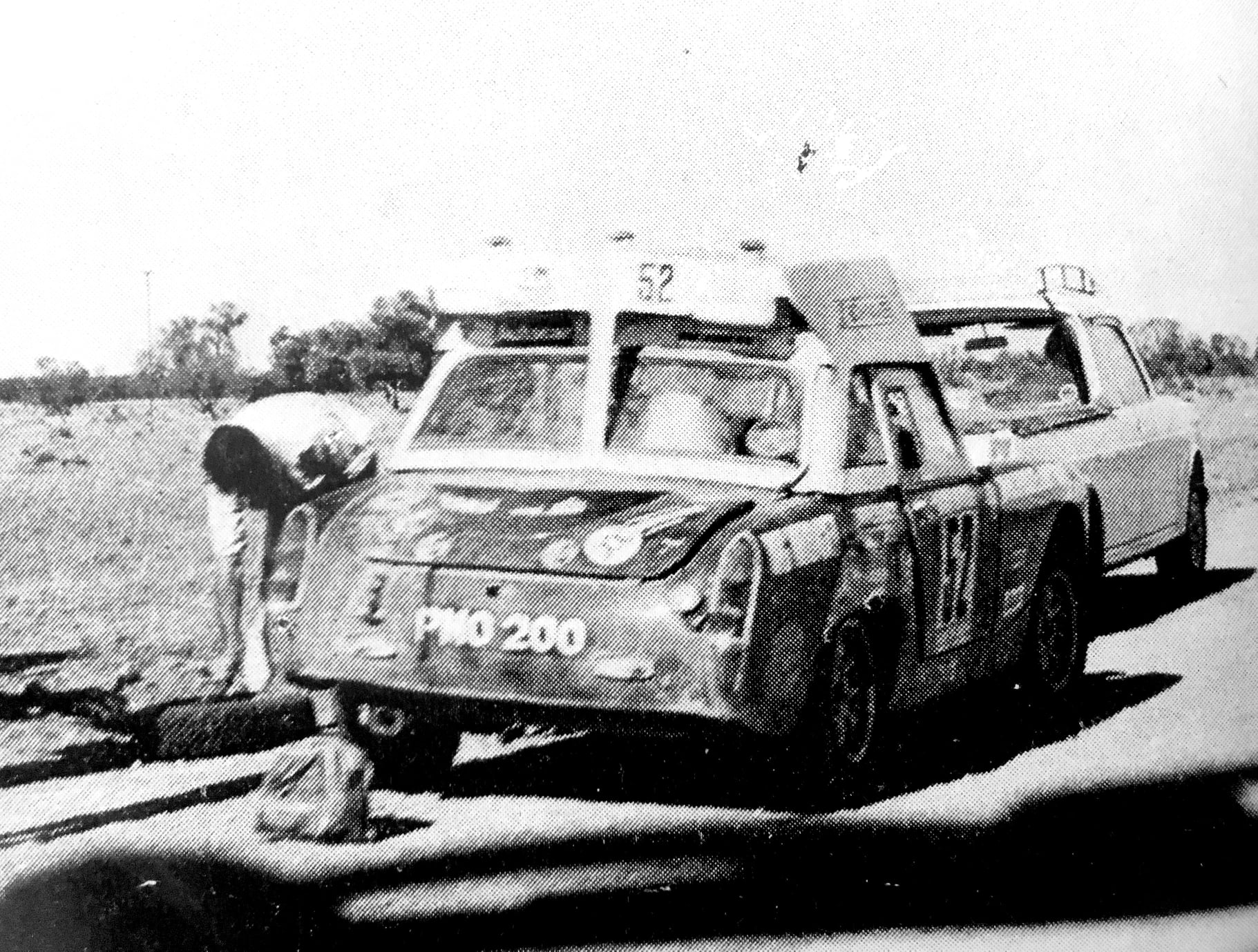This photo shows the 1968 London to Sydney Marathon car 52 MG Midget of John Sprinzel / Roy Fidler just after it retired with a broken stub axle.