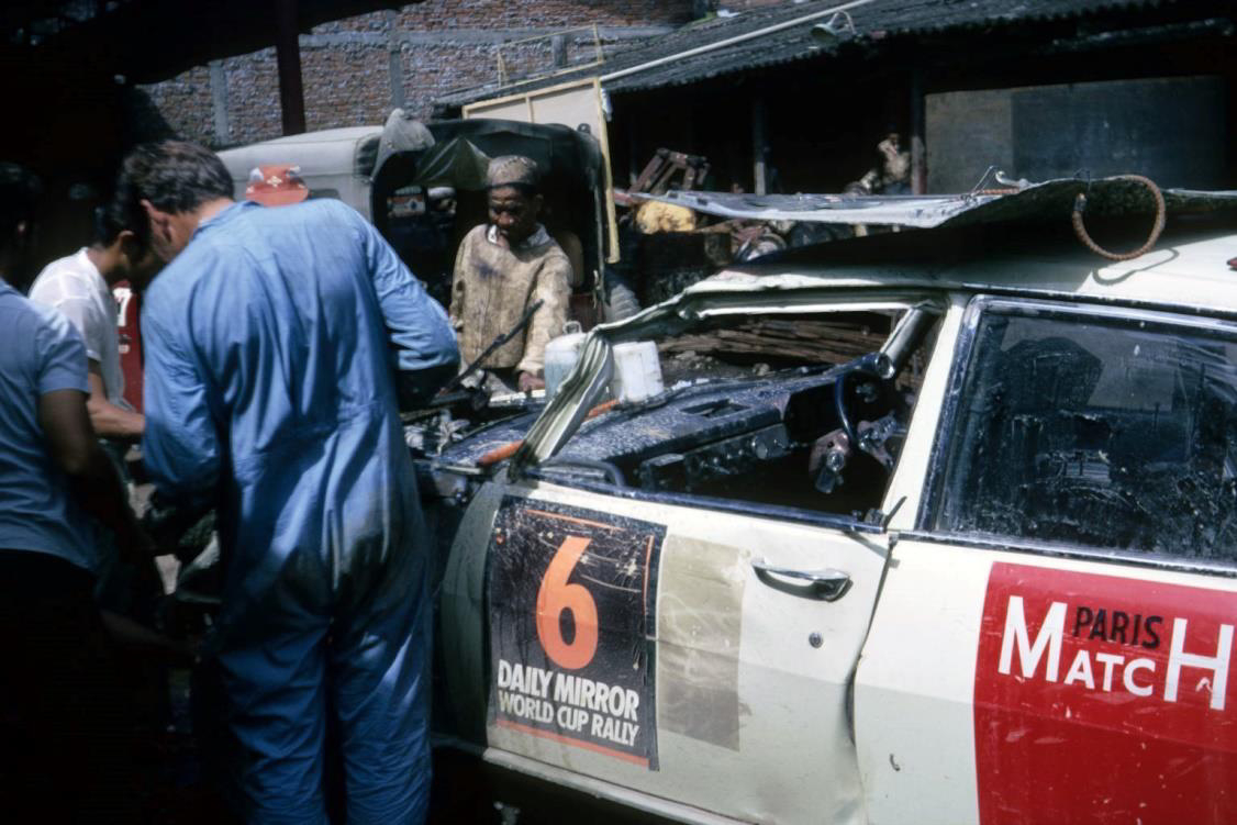 Peugeot 504, car 6, after final crash in 1970 WCR being repaired