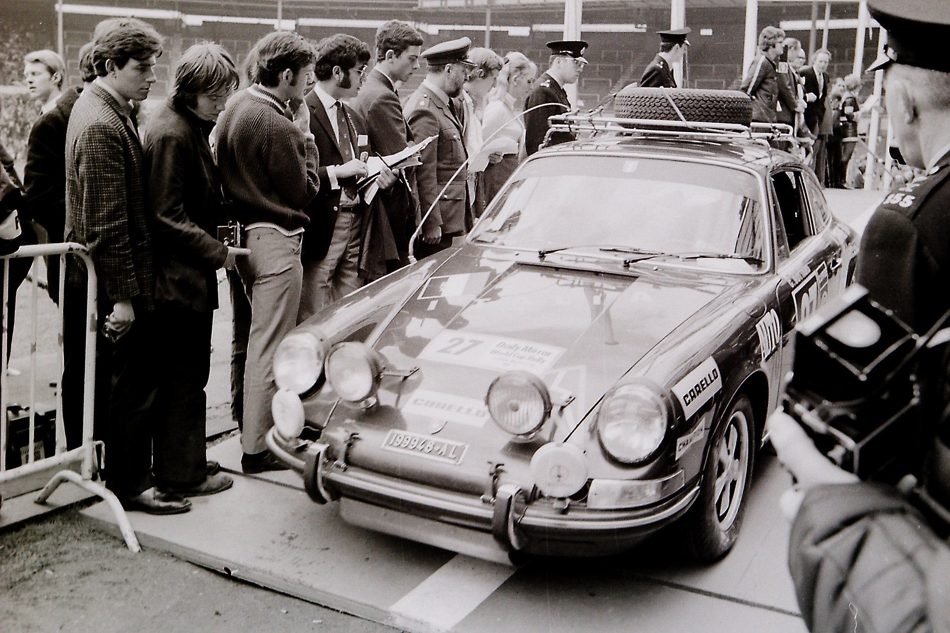 Porsche 911S car 27 at the start of the 1970 World Cup Rally