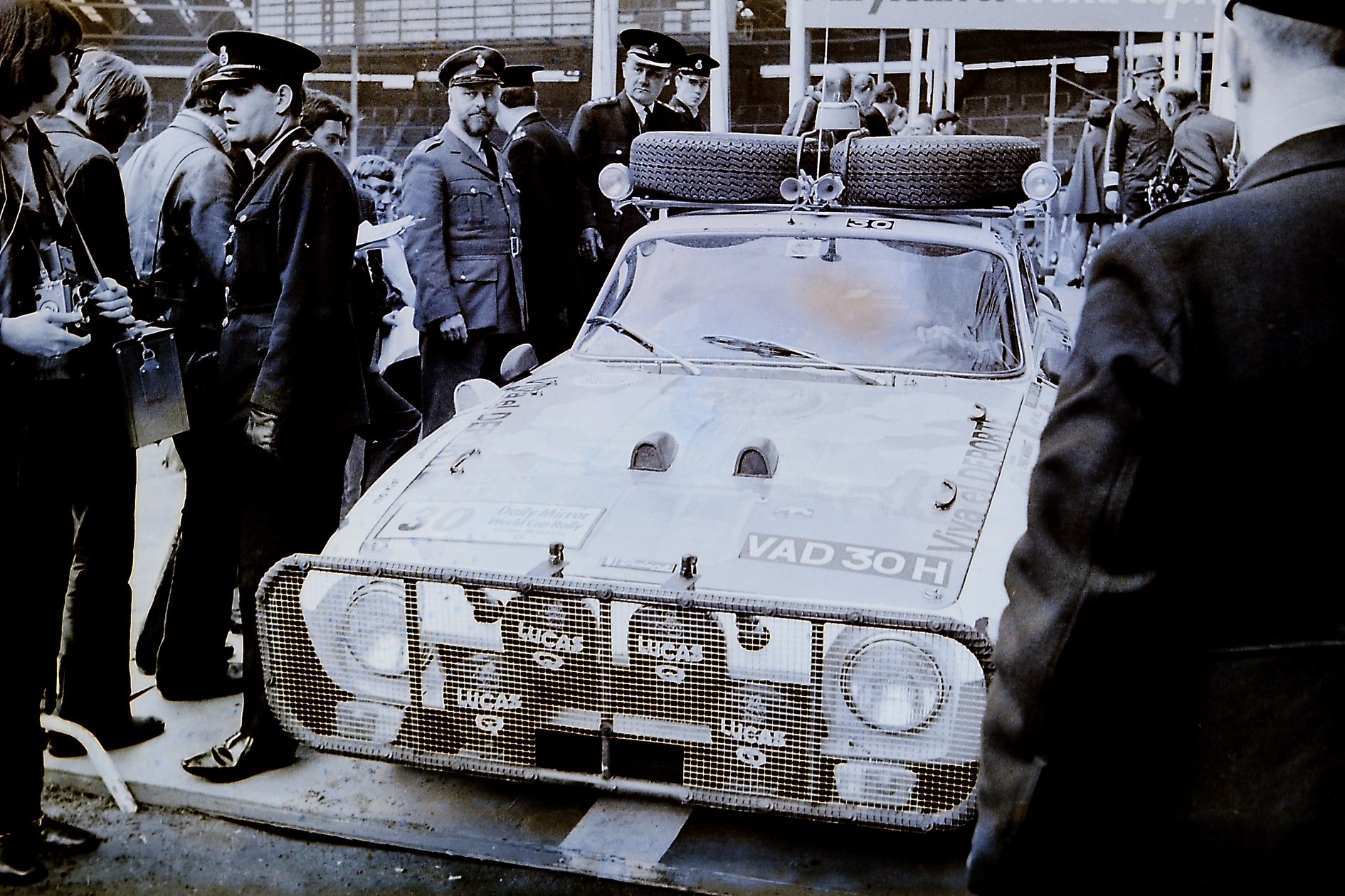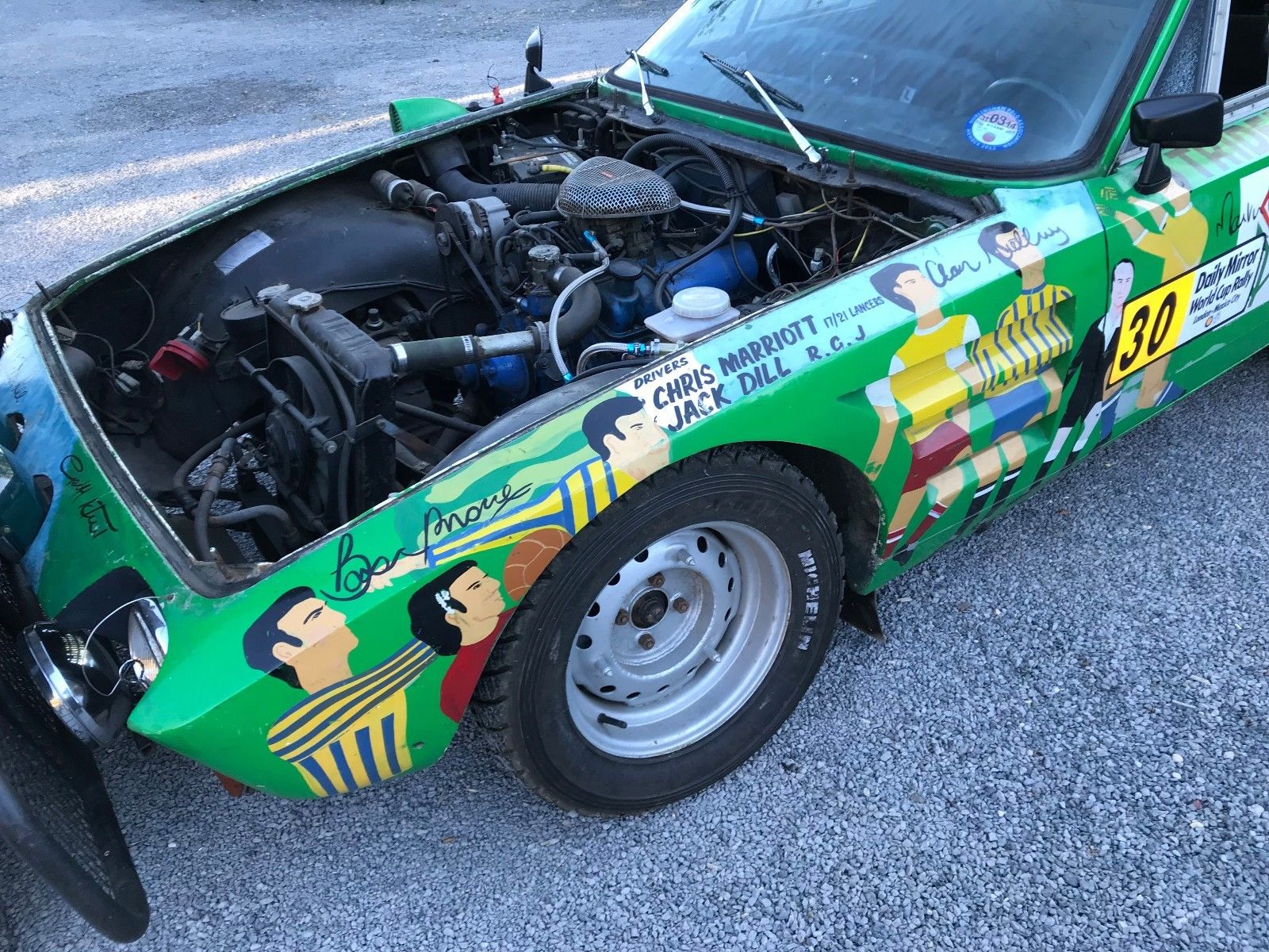 ‘VAD 30H’ was entrusted to Captains Marriott and Dill of the 21st Lancers and Royal Green Jackets respectively, both of whom were veterans of the 1968 London to Sydney Marathon. This car is known in rallying circles as ‘The Flying Picasso’ for its multi coloured paintwork depicting the World Cup and various footballers, painted on a green base. It is believed the car was signed by the then England football World Cup team however, the night before the race there were worries that green may be unlucky and so Bill Last’s wife hand-painted over it in white. Despite a promising start and good progress through mainland Europe, the car was damaged by a rock in Yugoslavia and whist fixing the bent steering arm, to co drivers helmet was also stolen. like many of the competitors, the Venturer never made it to Mexico. Forced to turn back, the intrepid Army officers maximised their duty free allowance by filling the large washer bottles with gin before heading home!